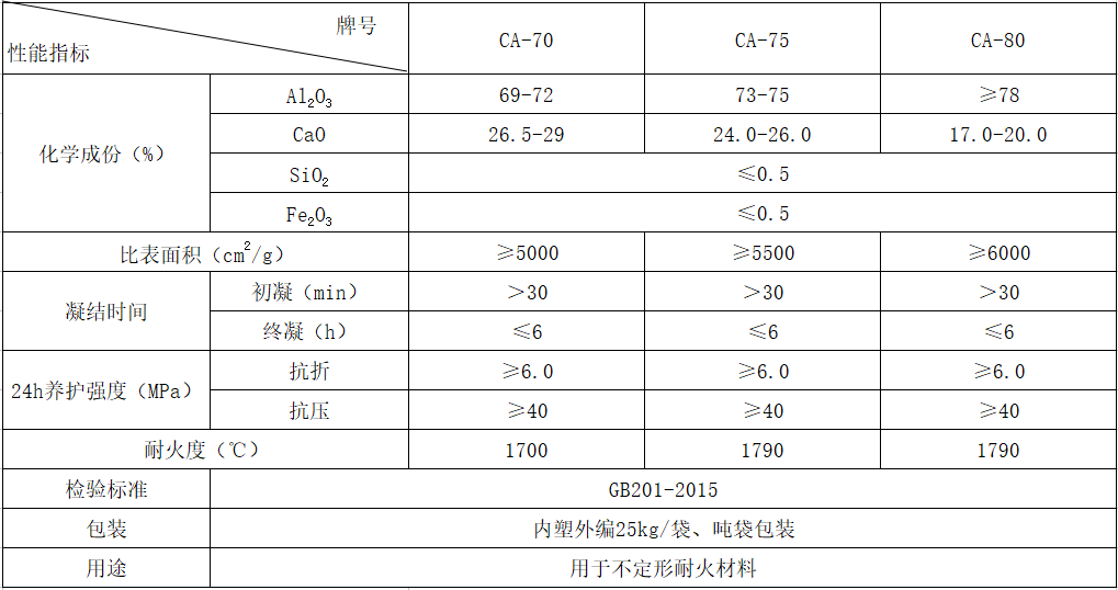 -根據國家標準(GB/T201—2015)的規定:純鋁酸鈣水泥的密度和堆積密度其細度為比表面積≥300m2/kg或45μm篩篩余≤20%。純鋁酸鈣水泥分為CA-70、CA-75、CA-80三個類型,各類型水泥的凝結時間和各齡期強度不得低于標準的規定。