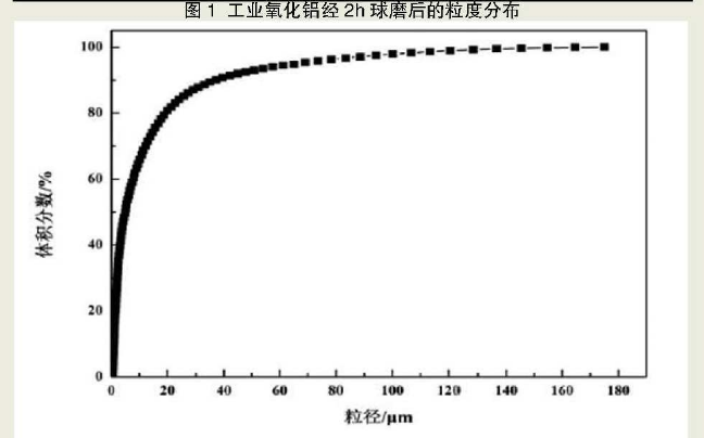 -球磨后原料的粒度為球磨2小時(shí)后工業(yè)氧化鋁的粒度分布曲線。球磨后工業(yè)氧化鋁的d10=0.970μm,d50=5.347μm,d90=33.224μm。球磨工藝有效降低了工業(yè)氧化鋁的顆粒粒徑,進(jìn)而提高了氧化鋁的相變轉(zhuǎn)化速率。這是因?yàn)轭w粒尺寸越小,反應(yīng)體系的比表面積越大,反應(yīng)界面和擴(kuò)散截面也相應(yīng)增加,鍵強(qiáng)分布曲線變平,弱鍵比例增加,所以反應(yīng)和擴(kuò)散能力提高。